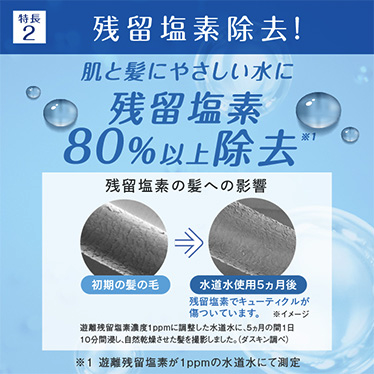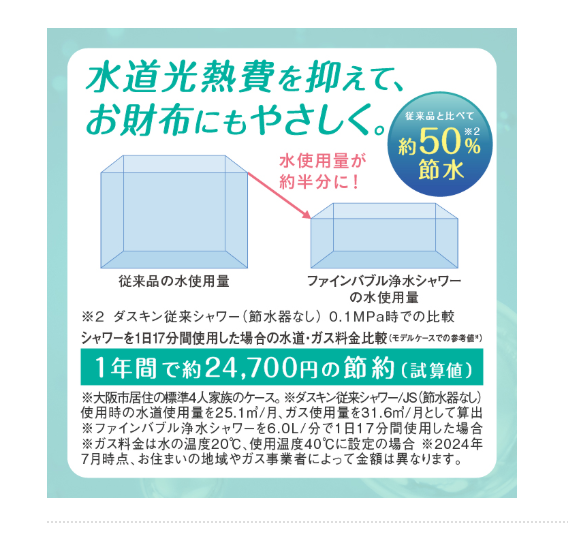 ダスキン独自の技術で水の使用量を従来品に比べ約50%も削減します。使うお湯が半分になるため、水道代はもちろん、お湯を沸かすガス代も同時に節約可能。さらに浄水機能が髪や肌にやさしい水をつくり、微細な泡がワンランク上の心地よいバスタイムを演出します。節約と快適さを両立し、エコな毎日を始めることが可能です!